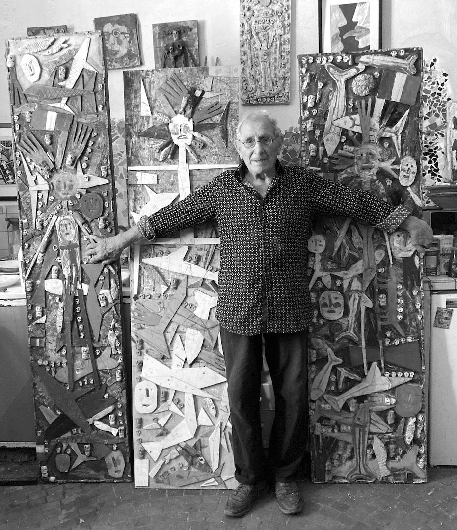 Bouchons de bouteilles, pinces à linge, jouets d’enfants, boules de croquet, filasse, glu, clous, boîtes de conserves vides, touches de piano, capsules, morceaux de bois, de tissus ou de cartons, il sciait, coupait, organisait, collait et peignait… Avril est parti ce 1er novembre à 99 ans. Très heureux de t’avoir connu !